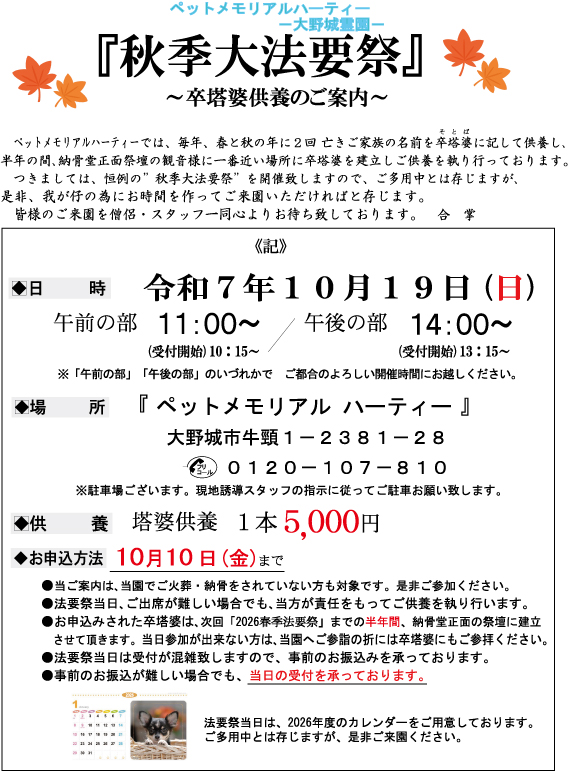 ハートランド福岡(筑紫野霊園) 2025年9月27日(土)・28日(日) 詳細はこちらをご覧ください ペットセレモ福岡(箱崎霊園) 2025年10月5日(日) 詳細はこちらをご覧ください ペットメモリアル ハーティー(大野城霊園) 2025年10月19日(日) 詳細はこちらをご覧ください |